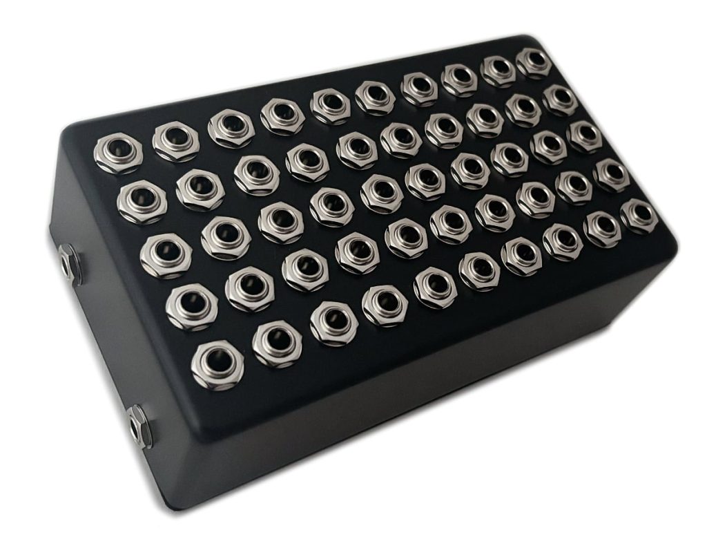 This device measures in at about 7.5″ x 4.5″ and weighs over 2 pounds due to the 52 jacks. The enclosure was an accidental order nearly 20 years ago and being an awkward size it’s been sitting and waiting for the right project. The top face happens to have the perfect amount of space for 50 jacks and the unusual height leaves plenty of clearance for the jacks to mount vertically. The completely passive design means no power supply is needed. I’m not entirely sure what will happen to this but one thing for certain is this will never be a production device from us.