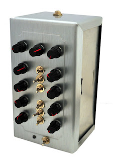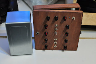 After speaking with a client he requested that his tone generator be rehoused from its cigar box into a steel napkin dispenser. The difficult part was fitting everything into a smaller face while clearing the internal springs of the napkin dispenser. This is what I received to work with:
